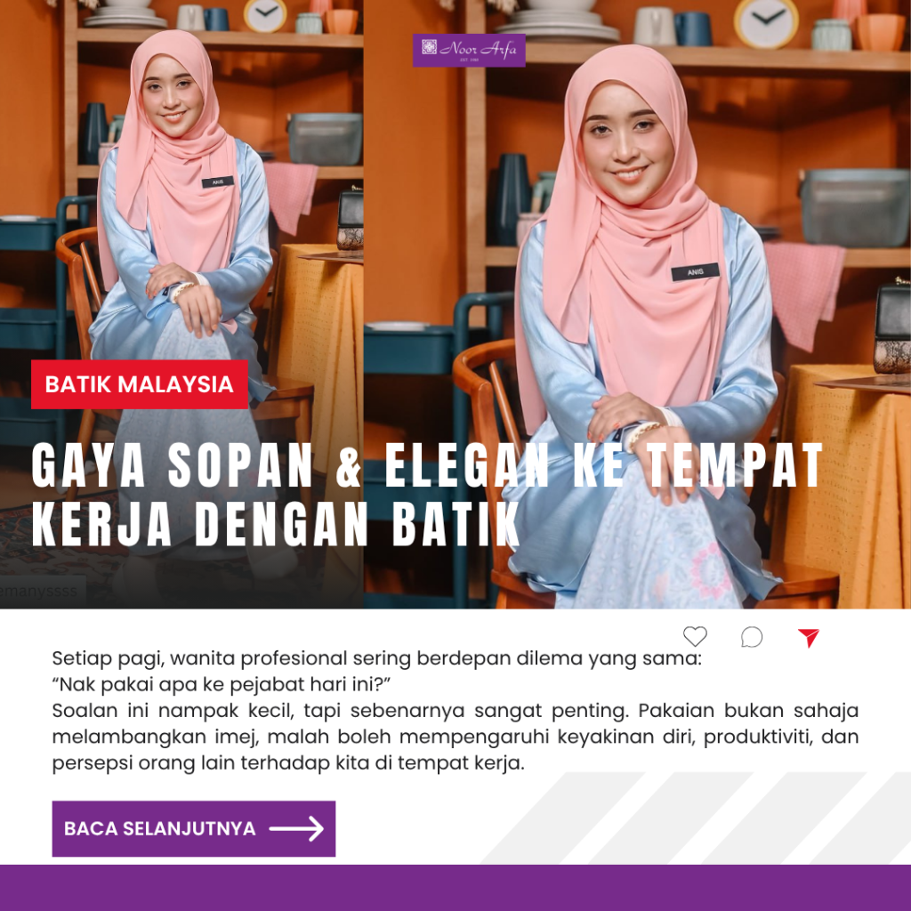 mustafa-z88 0 Noor Arfa 09 Jun 2025 June 9, 2025 Gaya Sopan & Elegan Ke Tempat Kerja Dengan Batik Setiap pagi, wanita profesional sering berdepan dilema yang sama:“Nak pakai apa ke pejabat hari ini?... Continue reading
