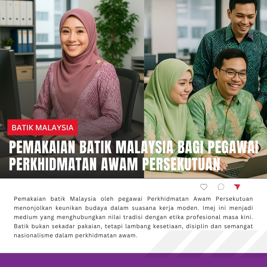 Untuk memastikan penampilan yang kemas dan berkualiti, penjawat awam perlu bijak memilih batik yang sesuai dari segi corak, warna dan jenis kain. Langkah pemilihan batik yang bagus bermula dengan memilih kain yang berkualiti tinggi seperti sutera, kapas atau viscose yang memberi keselesaan sepanjang hari bekerja. Perhatikan kehalusan corak dan keseragaman warna, kerana batik asli biasanya mempunyai perincian yang kemas dan tidak mudah luntur. Pilih corak yang sederhana dan warna yang harmoni, bersesuaian dengan etika berpakaian di tempat kerja supaya dapat menonjolkan keanggunan dan profesionalisme. Pastikan juga jahitan baju yang kemas dan potongan yang sesuai dengan bentuk badan, supaya pemakaian batik kelihatan rapi dan berwibawa. Dengan pemilihan yang tepat, batik bukan sahaja menyerlahkan gaya, tetapi turut memancarkan citra penjawat awam yang berhemah dan berbudaya.